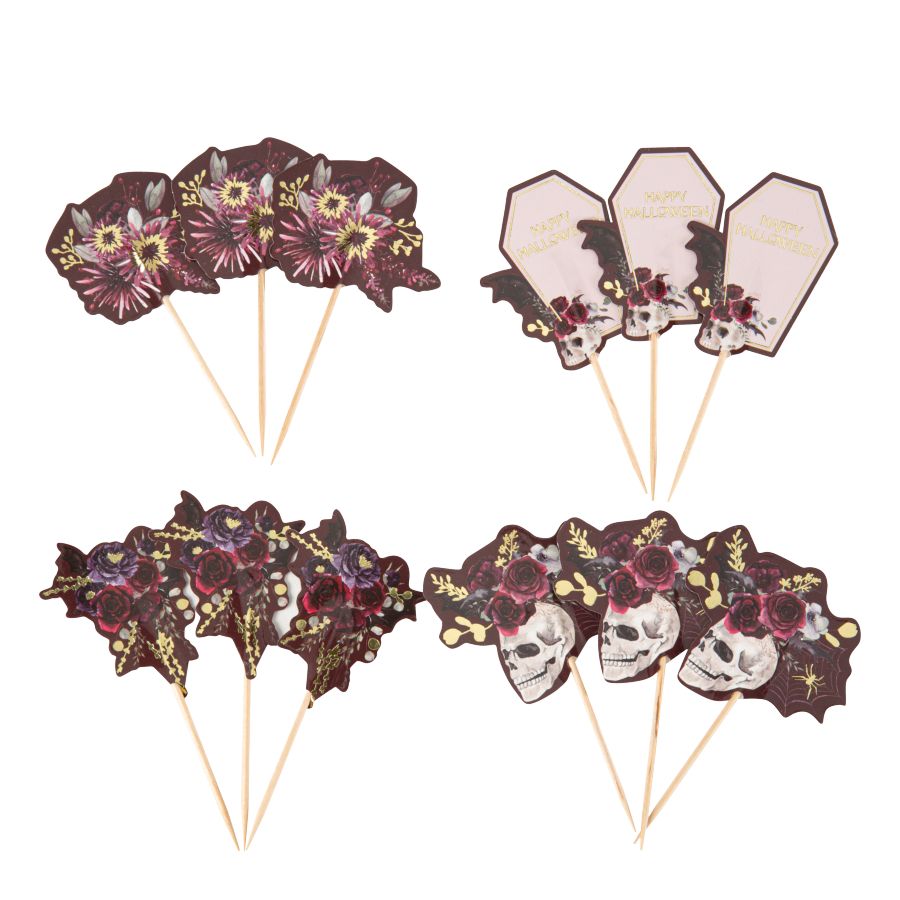 Immergiti nel mistico mondo di **Halloween** con questo set di 12 stuzzicadenti **Witchyland** "Happy Halloween". Questi divertenti accessori in **cartone** e **legno** sono perfetti per decorare torte, cupcake o qualsiasi altro dessert alle tue feste autunnali. Disponibili in dimensioni da **7 a 9 cm**, questi stuzzicadenti aggiungono un tocco di magia e creatività alle decorazioni della tua festa.
