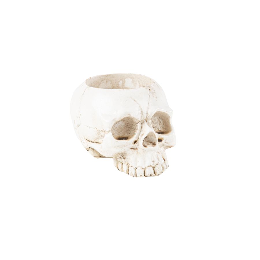 Aggiungi un tocco di mistero al tuo arredamento con questo portacandele a forma di teschio, perfetto per completare l'atmosfera festiva. Realizzato in resina bianca, questo elegante e resistente portacandele si integra perfettamente in qualsiasi arredamento aggiungendo un tocco di carattere. Immagina la luce soffusa di una candela che illumina ogni dettaglio di questo pezzo dal design unico.