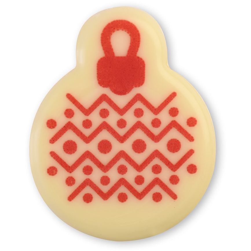 Ingredienti: Cioccolato bianco (95%), zucchero, burro di cacao, latte in polvere, emulsionante: lecitina di soia, aroma naturale di vaniglia, emulsionanti: E473, coloranti: E101, E120, E170. Allergeni: soia, latte. Può contenere tracce di frutta a guscio.