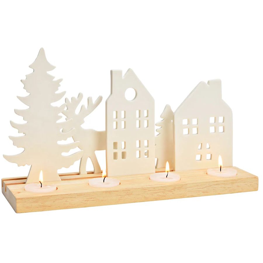 Composizione dell'Avvento bianca - Casa, abete e cervo in porcellana e legno