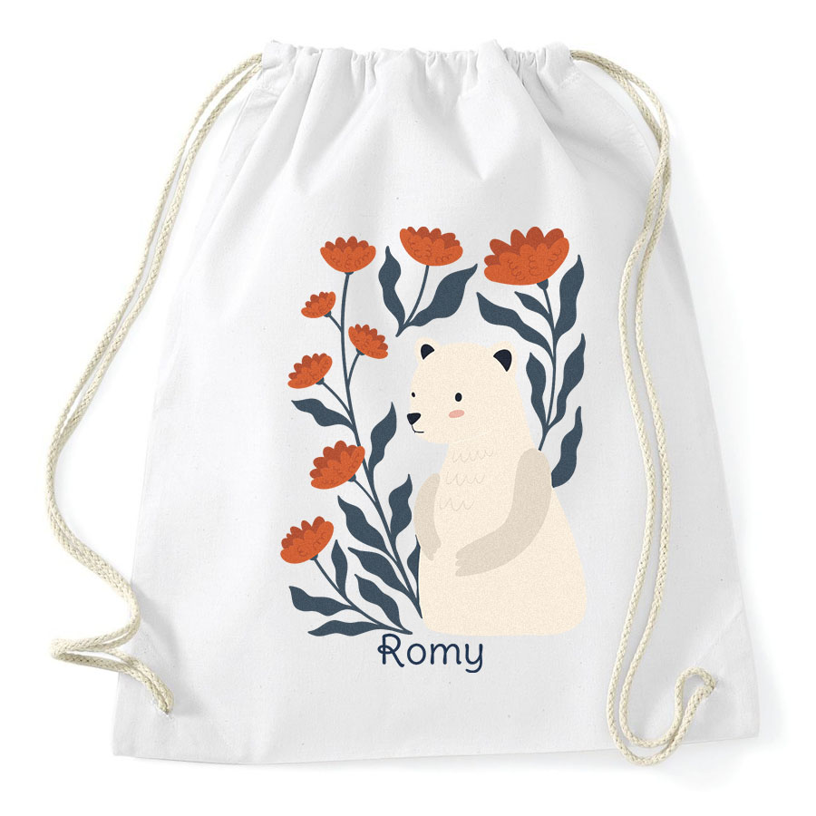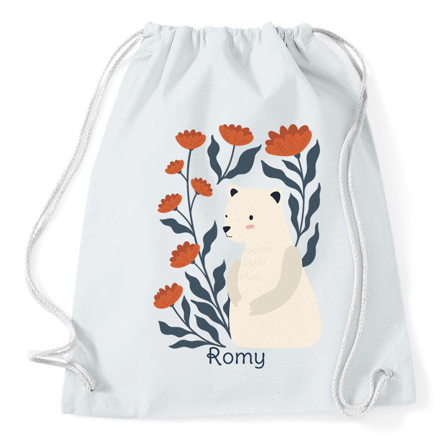 Una borsa per le attività personalizzata con il nome dell'orso: davvero fantastica! È perfetta per contenere tutto ciò di cui ha bisogno per la sua attività: pantofole, scarpe da ginnastica, abbigliamento sportivo, libri, giocattoli... Borsa da palestra, borsa sportiva o borsa da ballo, questo zaino in puro cotone va ovunque!