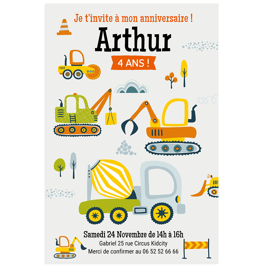Regala al tuo bambino una festa di compleanno memorabile con questi adorabili inviti personalizzati con veicoli da costruzione. Ogni biglietto, stampato su un lato, è accompagnato da una busta coordinata di Clairefontaine, un marchio rinomato per la sua qualità e la produzione francese. Questi inviti aggiungeranno un tocco personale a questo evento speciale e strapperanno un sorriso a tutti i piccoli ospiti.